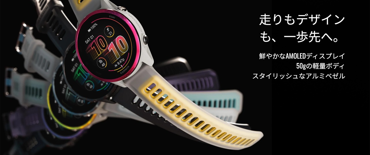 また、Forerunnerシリーズ初めてのアルミニウムベゼルを採用し、スタイリッシュな見た目となっています。