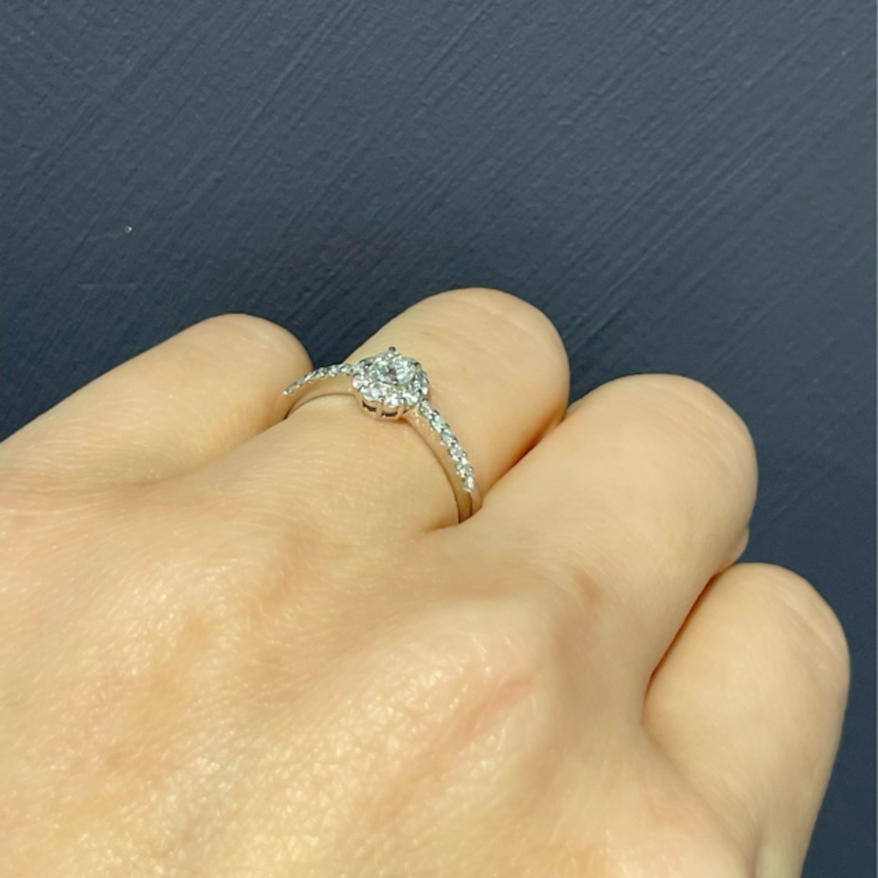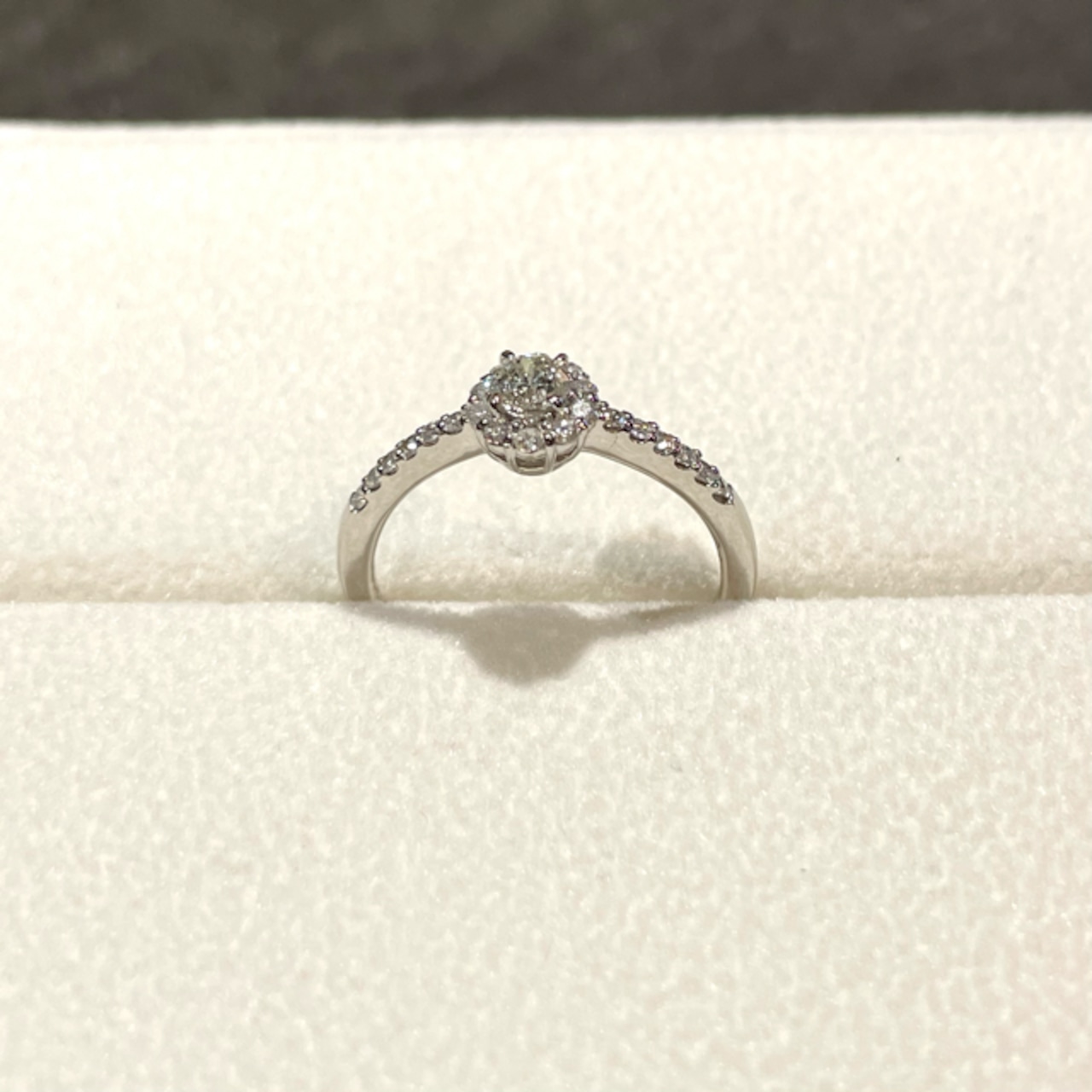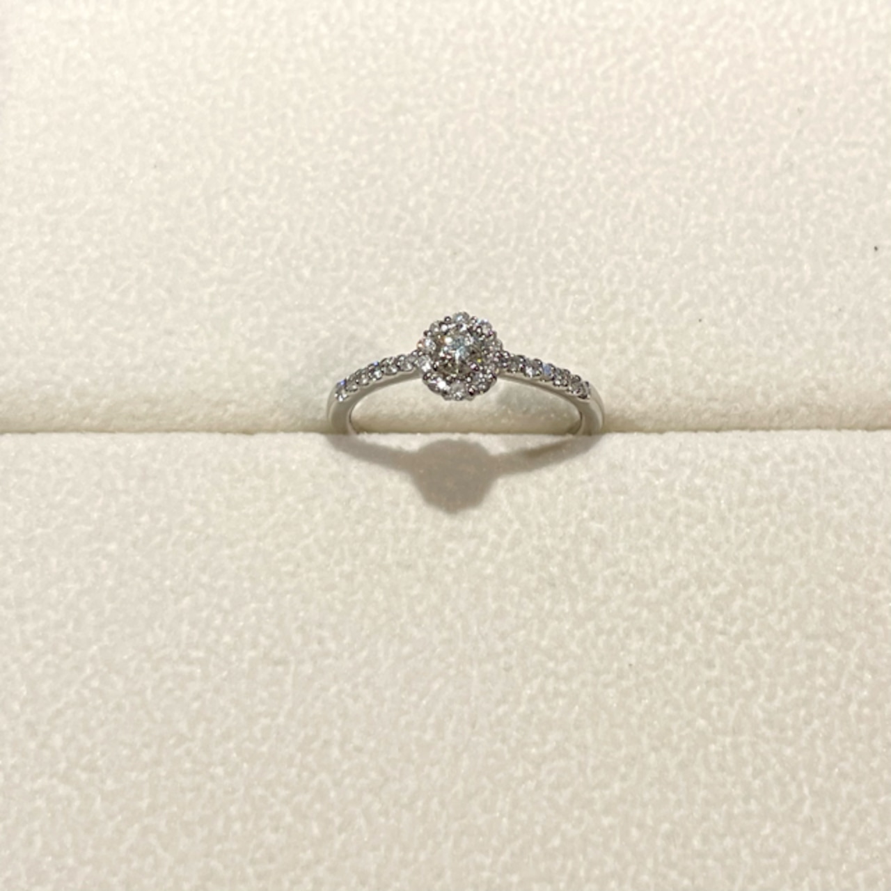ダイヤモンドの周りを細かなダイヤモンドで囲んだ存在感のあるデザイン。